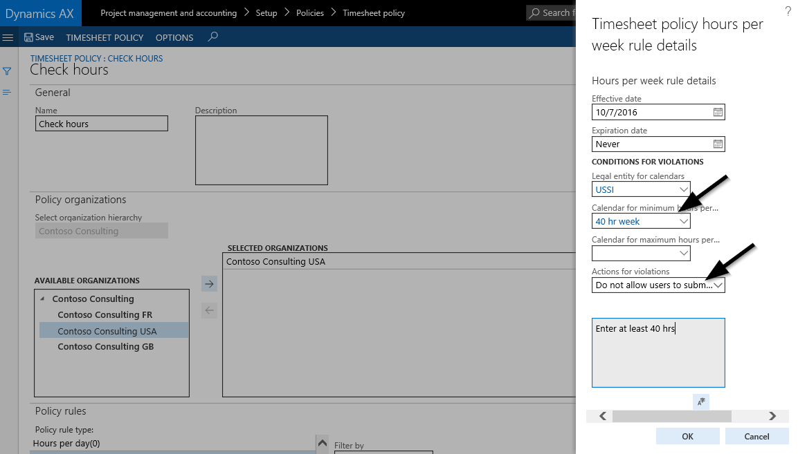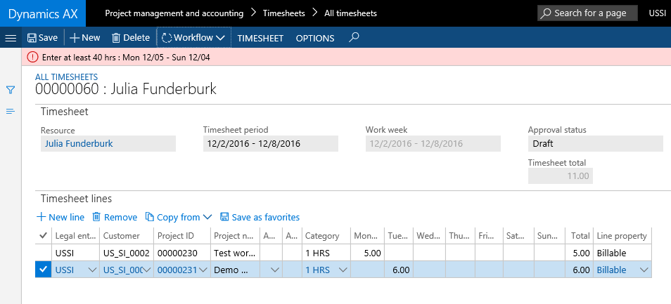 The timesheet policy illustrated in the screen-print above prevents users from submitting and posting timesheets with less than 40 hours working time recorded. Timesheets that include less hours – such as the one shown below – cannot be submitted and will consequently be picked up in the missing timesheet report. The following screen-prints exemplify this system behavior.
