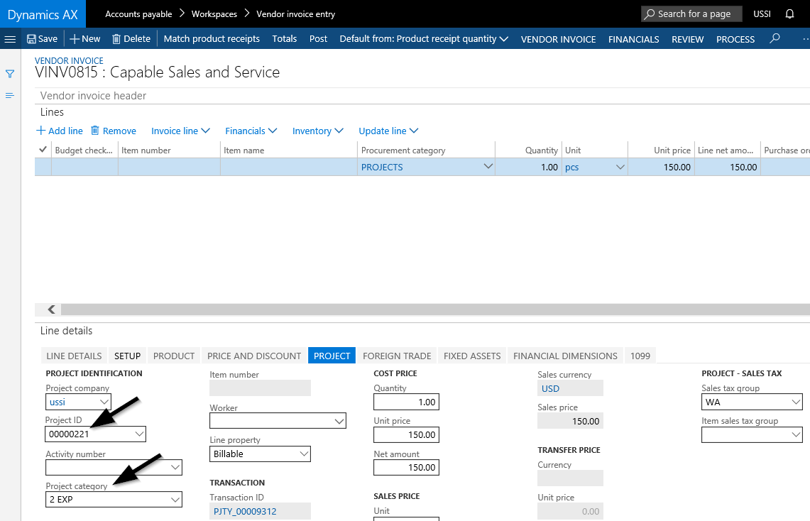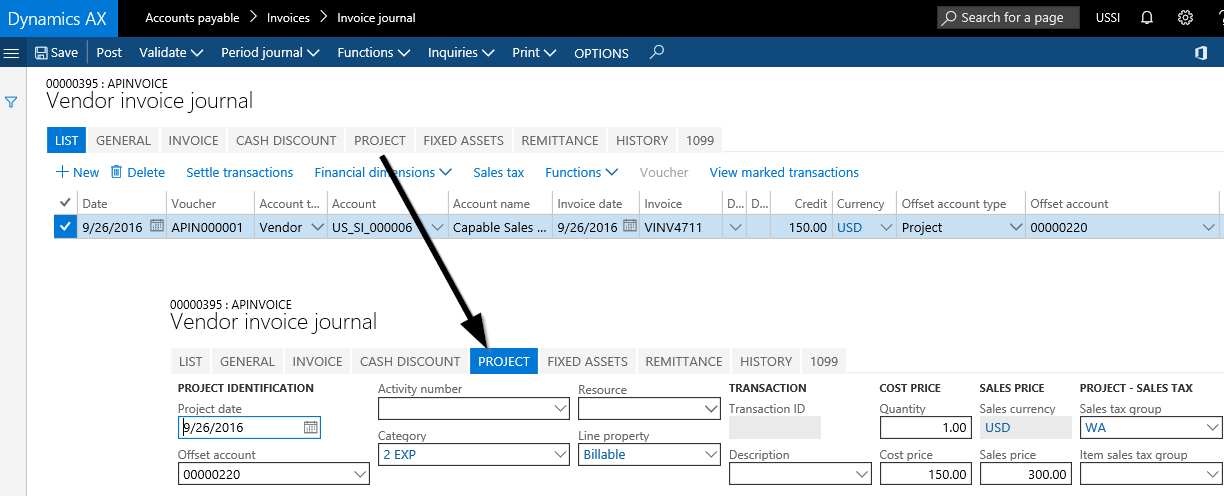 Let’s get started with the process of recording an expense invoice for a project through a vendor invoice journal, which is shown in the next figure. Please note that the vendor invoice line and the project to which the expenses are posted to, are shown in the upper part of the next screen-print whereas all project specific information is included in the project tab shown in the lower part of the same screen-print.