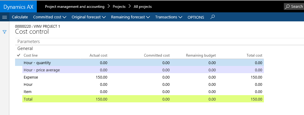 As one might expect, after recording the invoice but before posting it, no costs can be identified at the project level. Please see the next figure.