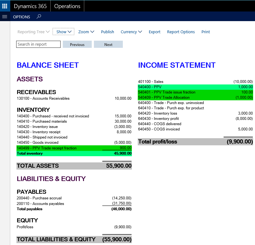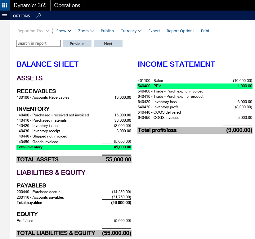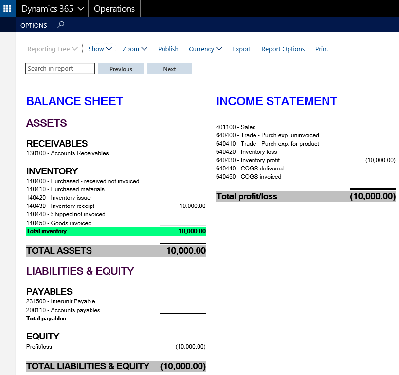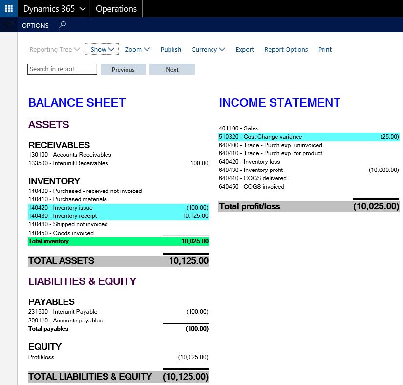 The following example illustrates this scenario where initially 100 pcs of a standard cost item with a cost price of $100/pcs are acquired – for reasons of simplicity – through an inventory adjustment journal. The next screen print shows the resulting financial statements.