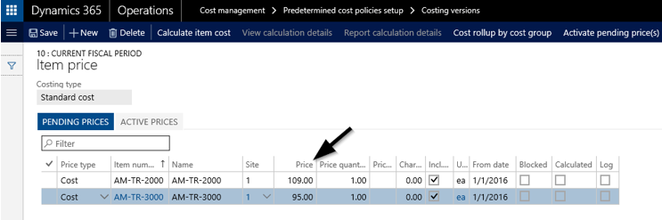 Standard costs can be setup in a way that different standard cost prices are defined per site in order to incorporate cost price differences resulting for example from transportation costs, etc. The next screen print exemplifies an item that has different cost prices setup for site 1 and site 2.