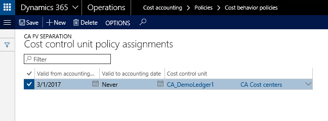 Once the fixed and variable cost parts are specified, the cost behavior policy needs to be linked to the cost control units of the cost accounting ledger, which can be achieved by selecting the ‘policy assignment for cost control unit’ button shown in the previous screenprint.