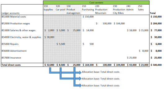 Rather than that, I determined that all costs of those cost centers are first totalled with the help of this formula: https://dynamicsaxfico.files.wordpress.com/2017/07/206_en_part7_0010.png