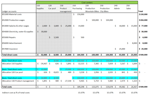 Executing such kind of allocations necessitates the use of an iterative approach that allocates the costs of the indirect cost centers several times until all costs are allocated to the operative (‘direct’) cost centers no. 210-250.