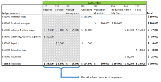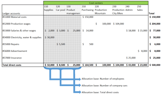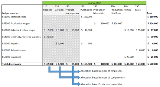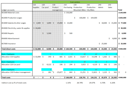 The cost center costs of the ‘120 INDIRECT’ group are allocated based on the number of company cars and the cost center costs of the ‘130 INDIRECT’ group are allocated based on the total direct costs of the other ‘direct’ or operative cost centers.