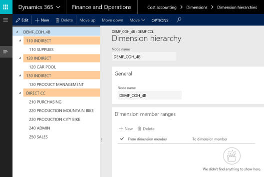 To realize the multiple base hierarchical allocation approach, a new cost object dimension has been setup that includes three additional summary nodes (‚110 INDIRECT’, ‘120 INDIRECT’ and ‘130 INDIRECT’). In the example used, each of those summary nodes holds a single cost center only.