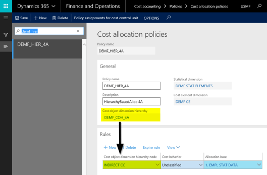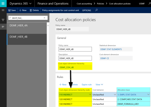 With the new cost object dimension hierarchy in place, one can then refer to the different indirect summary hierarchy nodes when setting up cost allocation policies. This is exemplified in the next screenprint that shows how the different indirect cost object nodes are linked to allocation bases for cost allocation purposes.