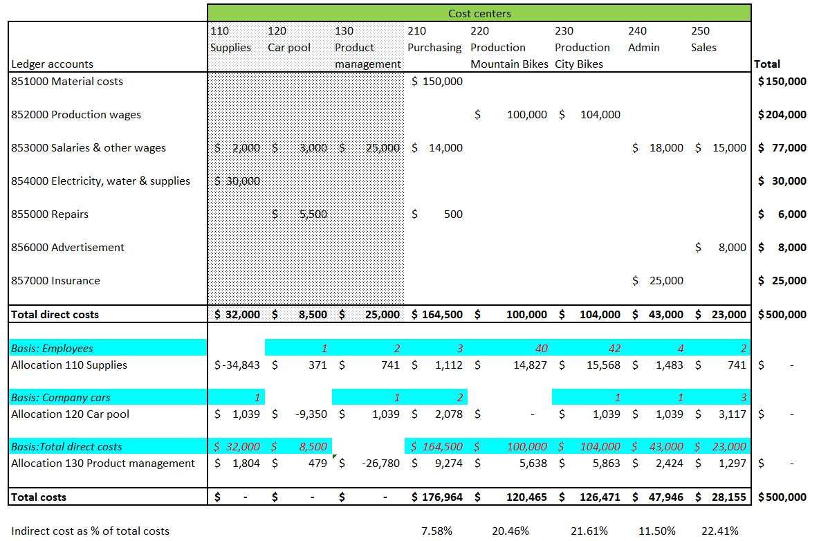 The cost center costs of the ‘120 INDIRECT’ group are allocated based on the number of company cars and the cost center costs of the ‘130 INDIRECT’ group are allocated based on the total direct costs of the other ‘direct’ or operative cost centers.
