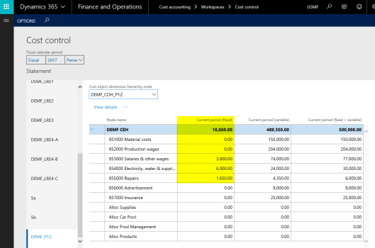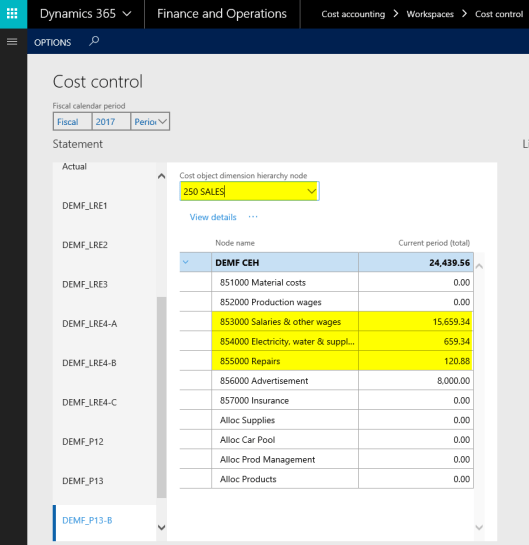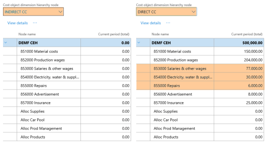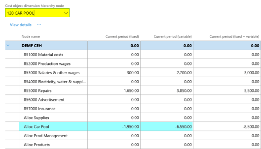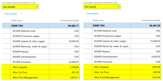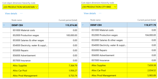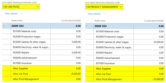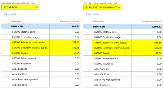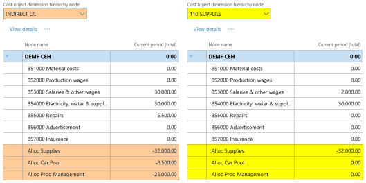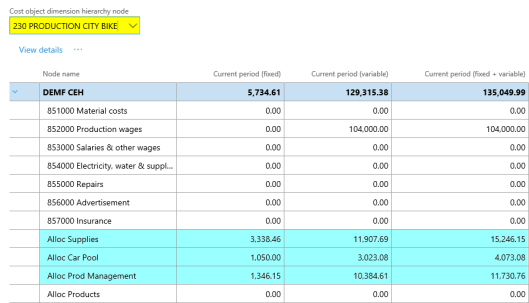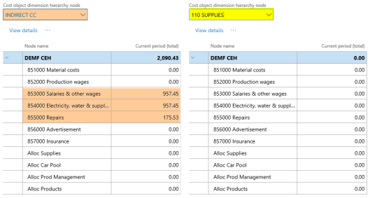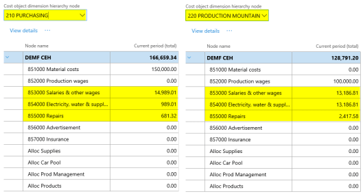 After setting up the cost accounting ledger and processing the data and the cost distribution policy, the following costs can be observed from the cost controlling workspace for the different indirect cost centers: