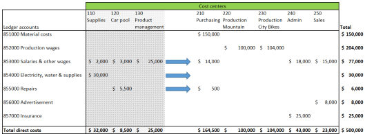 Applied to the previously used example, cost distribution policies should distribute the costs from the indirect cost centers to the direct ones, as indicated by the arrows shown in the next figure.