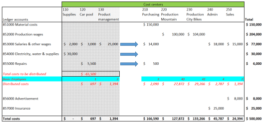 As one can identify from the prior screenprints, some costs remain at the indirect cost centers no. 120 and 130. The underlying reason for this outcome are cost distributions that are made within the group of the indirect cost centers. Those distributions are caused by the employee allocation basis used. The next graphical overview aims to illustrate the underlying issue.
