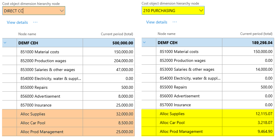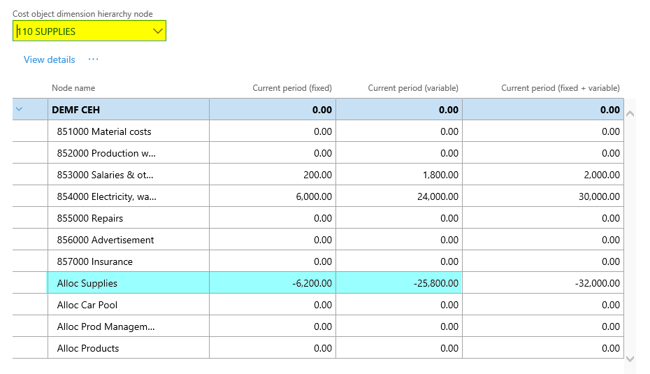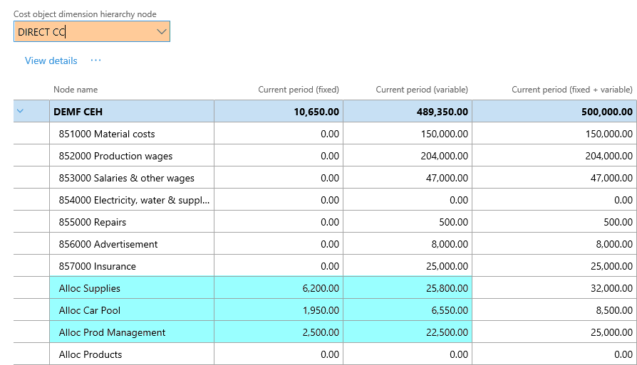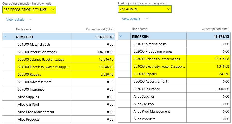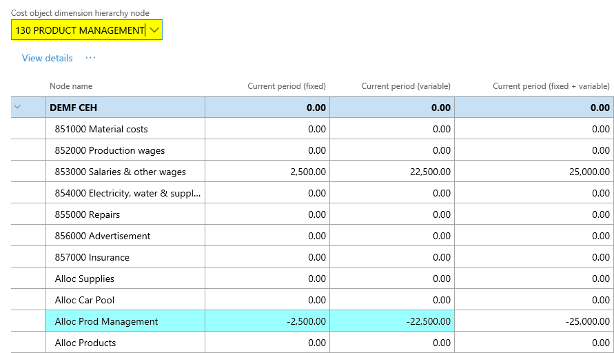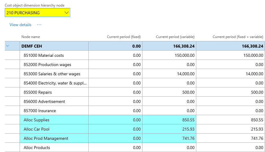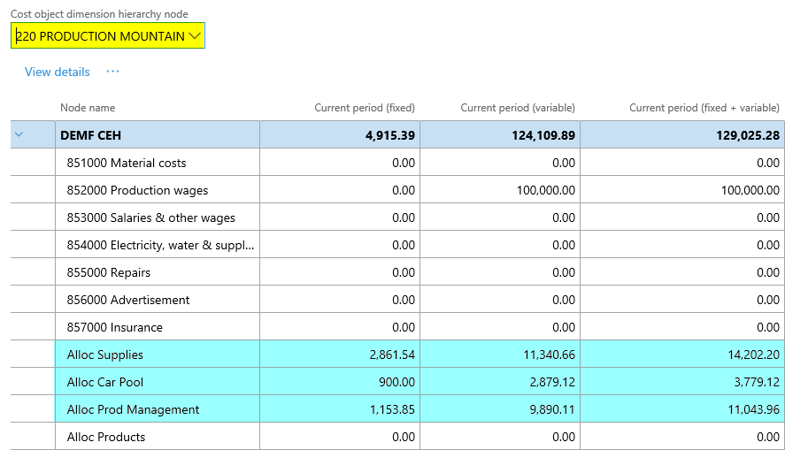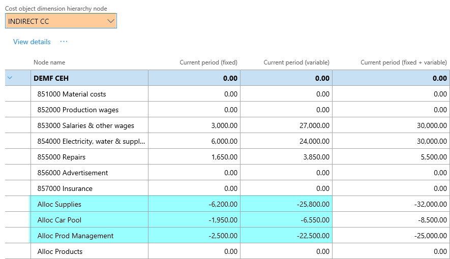 After setting up the cost accounting ledger and processing the data and the cost distribution policy, the following costs can be observed from the cost controlling workspace for the different indirect cost centers:
