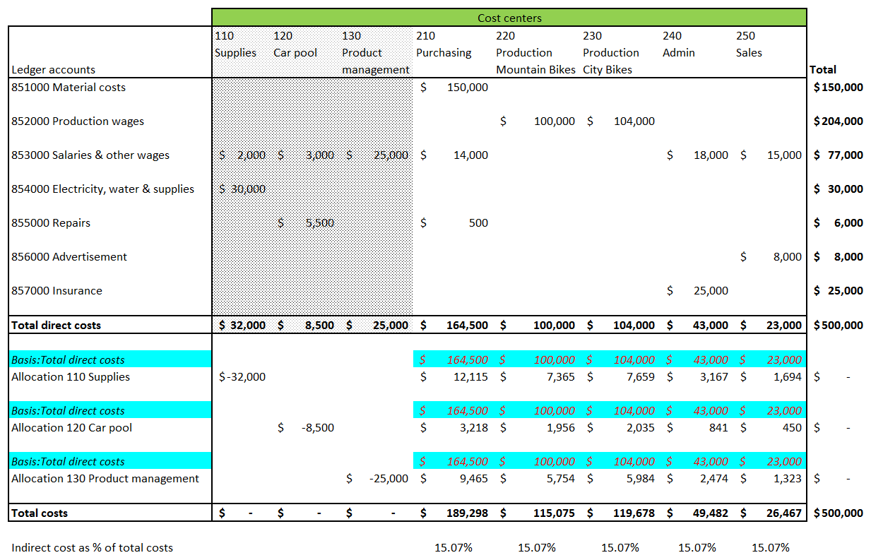 As one can identify from the prior screenprints, some costs remain at the indirect cost centers no. 120 and 130. The underlying reason for this outcome are cost distributions that are made within the group of the indirect cost centers. Those distributions are caused by the employee allocation basis used. The next graphical overview aims to illustrate the underlying issue.