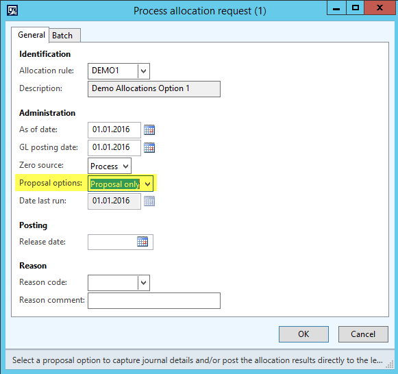 The last step is running the periodic ledger allocation process that generates the allocation transactions in the allocation journal. When starting this process you can either directly post the allocations (selection “post only”) or generate an allocation proposal that you can check and post later on (selection “proposal only”).