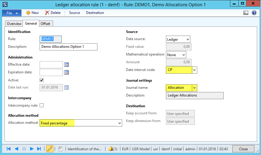 To me, the first two methods (basis & fixed percentage) seem to be the most important ones in practice. (Note that the basis allocation method allows making allocations based on amounts that have been posted on other ledger account – financial dimension combinations).
