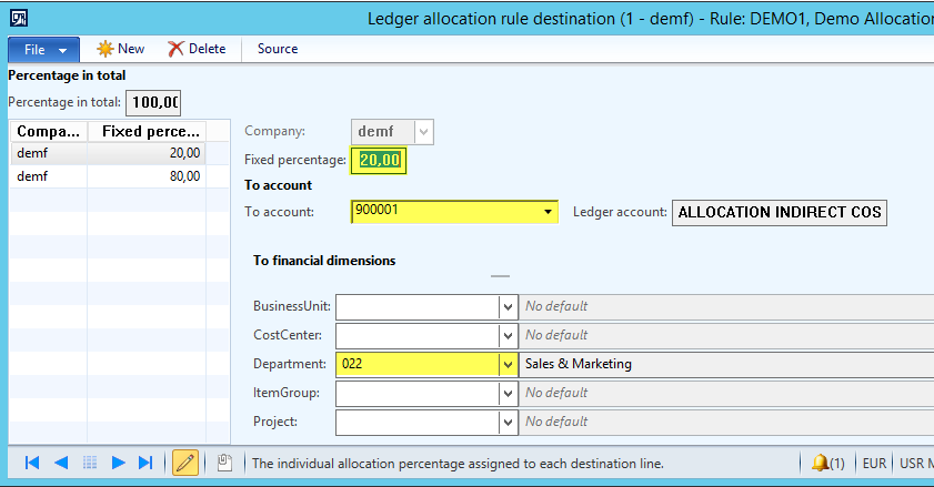 After you defined what shall be allocated, you have to define where the costs shall be allocated to. Also this setup is pretty straightforward as you simply have to specify a percentage figure together with the ledger account–financial dimension combination.