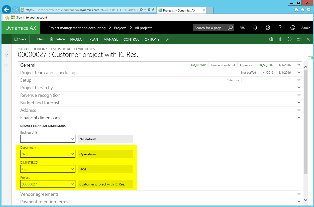 After setting up the project in FRSI, the employee engaged in company USSI is setup. This setup does not require some special considerations except that it is advisable linking the employee to its department / cost center and intercompany financial dimension, as exemplified in the next screen-print.