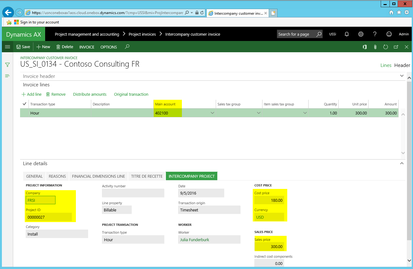 The next process step consists of creating the intercompany project invoice in company USSI. This can be realized by using the corresponding intercompany project invoice functionality. Example: