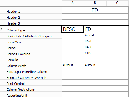 The column definition used was identical to the one used in the Microsoft guideline and included only a single FD (financial dimension) column. The next screen-print illustrates the setup of this so-called column definition.
