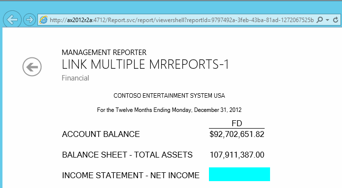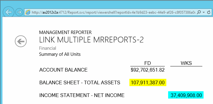 warningsign1In order to allow you a direct comparison with the Microsoft guideline referenced in the beginning, all setups and reports exemplified in this post have been created with the MR version CU12. In more recent MR versions, the link type ‘Financial dimension + Worksheet’ has been removed. As a result, linkages to multiple MR reports can only be realized through the ‘Management Reporter Worksheet’ link that has been used for incorporating the IS data above.