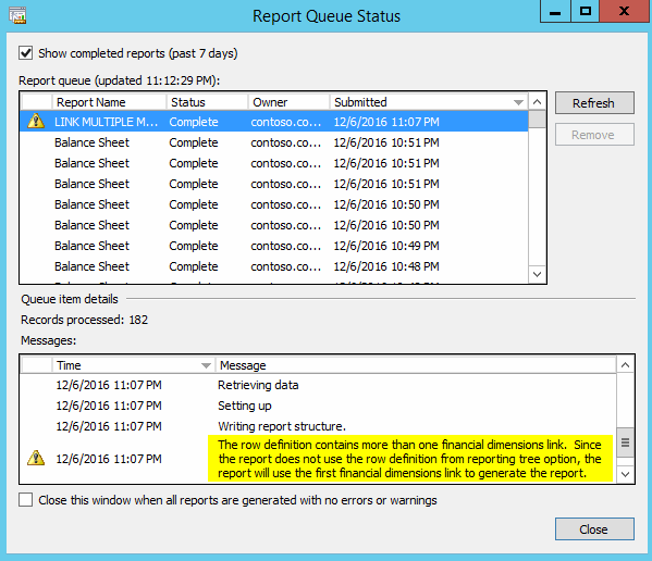 warningsign1 It is important that all financial dimensions/worksheet references, which are specified in the row definition form are included in the reporting tree. Otherwise, the report generation will interrupt with an error message.