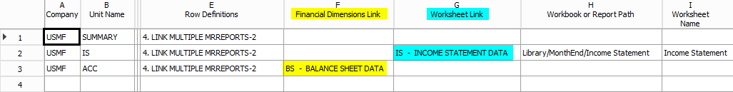 For that reason (and based on the Microsoft guideline), I simply added two instead of a single row link in my MR row definition to get the data from the BS and IS report loaded into my newly created report. The next screen-print exemplifies this setup, where the first row link (‘BS’) links to the Balance Sheet report and the second one (‘IS’) links to the Income Statement report.
