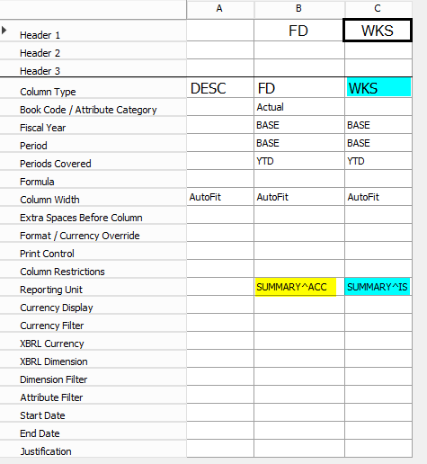 The row definition of my newly created report consequently includes two rather than a single column that reference the cells in the already existing MR reports through the ‘@WKS(…)’ fields.