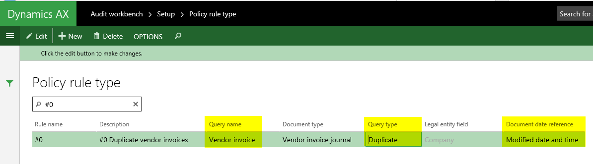 The first thing that needs to be setup in this module is a policy rule type that makes use of a predefined query (“vendor invoice”) that is incorporated into standard Dynamics AX. The query type used is “duplicate” as we want to search for invoices that have been entered more than once. (Additional information on the available query types can be found on the following TechNet site).