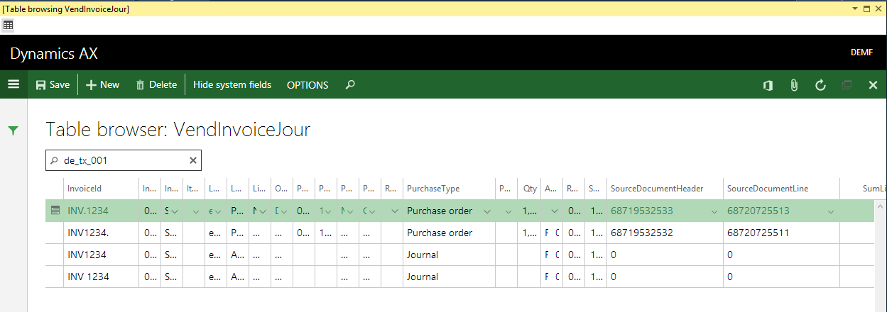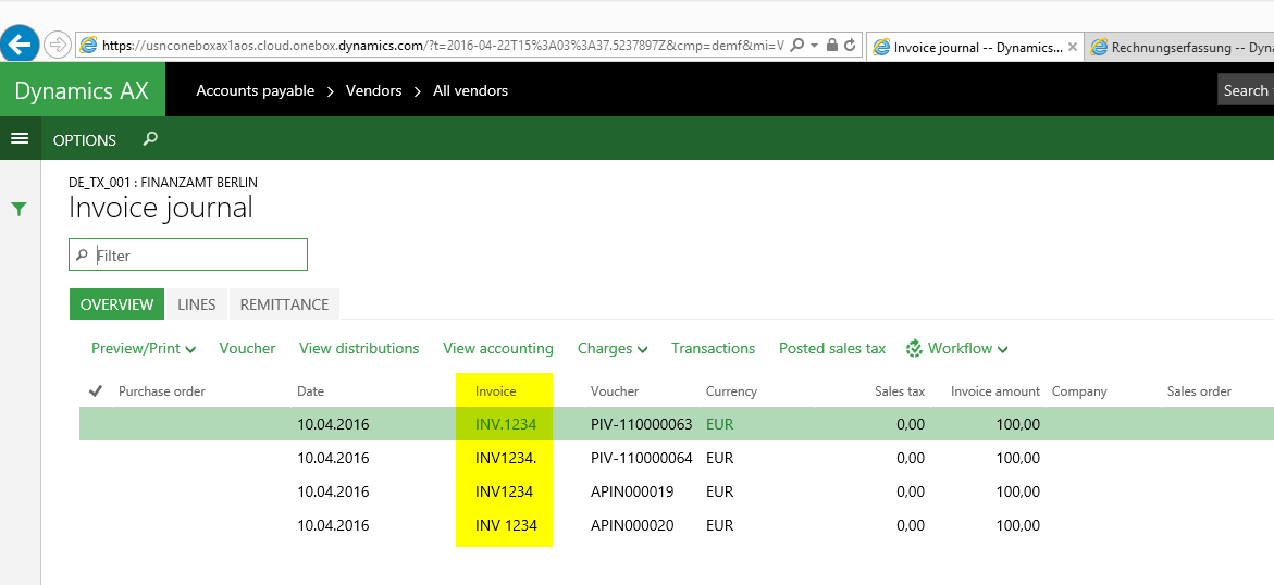 Next, two invoices are recorded in a vendor invoice journal. The first invoice is entered with invoice number “INV1234” and the second one with invoice number “INV 1234”. That is, the second invoice is recorded with a blank between the term “INV” and the invoice number. Because of that blank, Dynamics AX treats both invoices as distinct records.